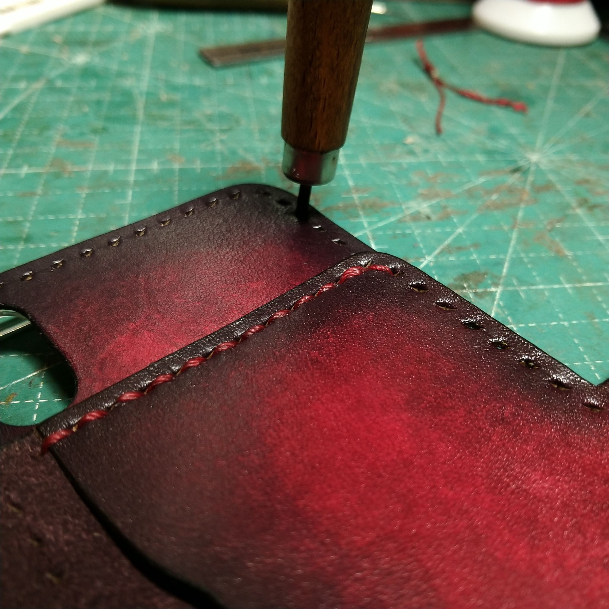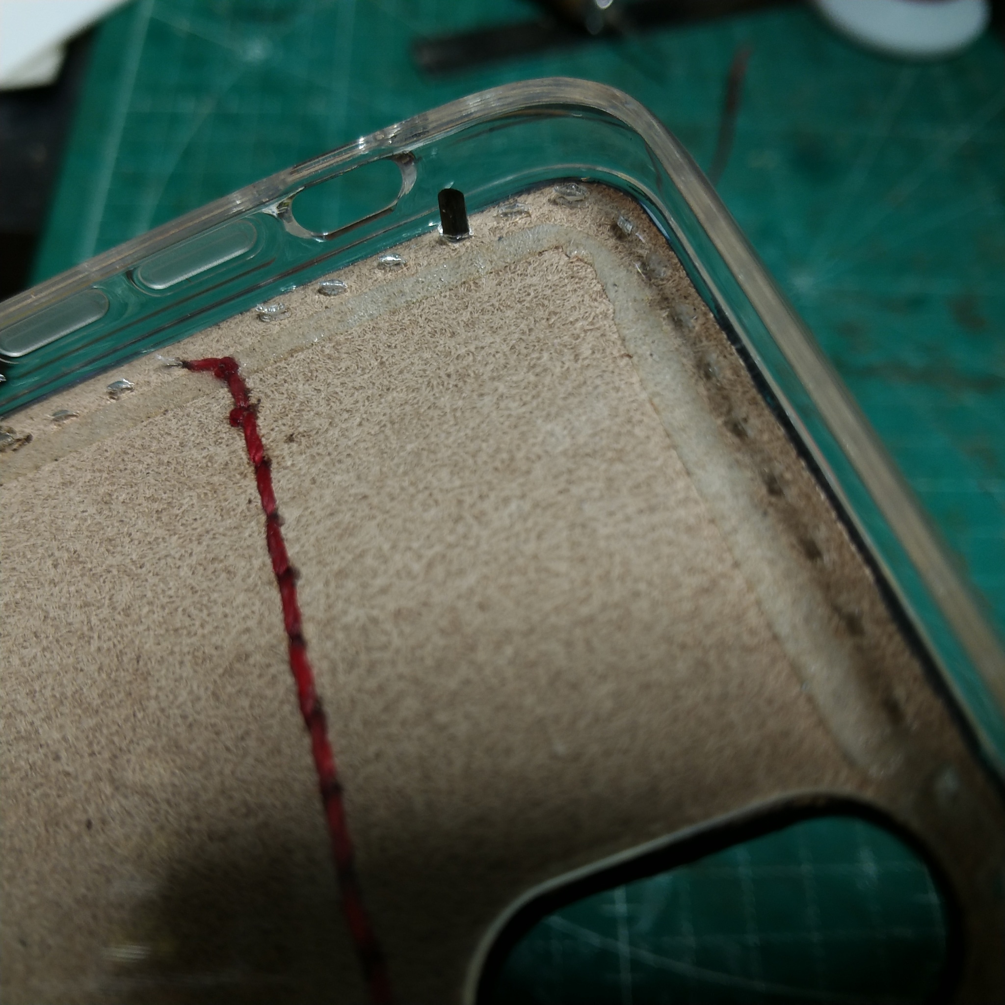 革とシリコンケースを目立たない両面テープで固定し、手縫い用の穴を一つ一つあけていきます